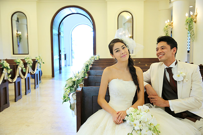 歴史あるステンドグラスの前での撮影は本格的な結婚式のように厳かな雰囲気。