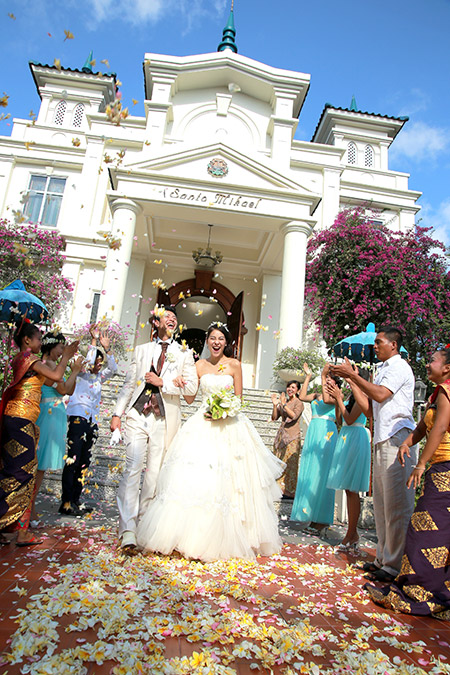 ガーデンバージンロードは約25m。南国の緑に映える白亜の教会をバックに。